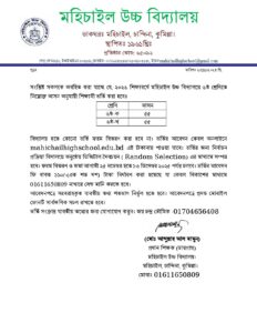 - মহিচাইল উচ্চ বিদ্যালয়ের সকল শিক্ষার্থীদের অবগতির জন্য জানানো যাচ্ছে যে, আগামী ২০/১১/২০২৫ খ্রিঃ তারিখে ৬ষ্ঠ শ্রেণি হতে ৯ম শ্রেণি পর্যন্ত সকল শ্রেণির বার্ষিক পরীক্ষা আরম্ভ হবে । সকল শিক্ষার্থীদের বিদ্যালয়ে তাদের বকেয়া পরিশোধ করে প্রবেশপত্র সংগ্রহ করার জন্য বলা হলো।-প্রধান শিক্ষক